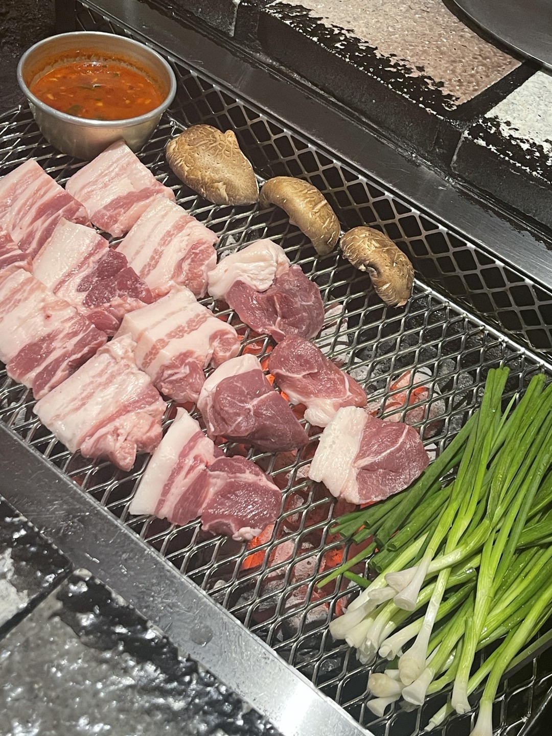 고기 위에 쪽파를 올려서
